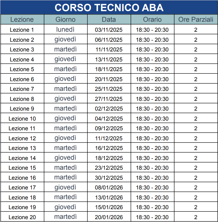 Il corso ABA ha una durata complessiva di 70 ore e include 40 ore di lezioni e 30 ore di esercitazioni pratiche.